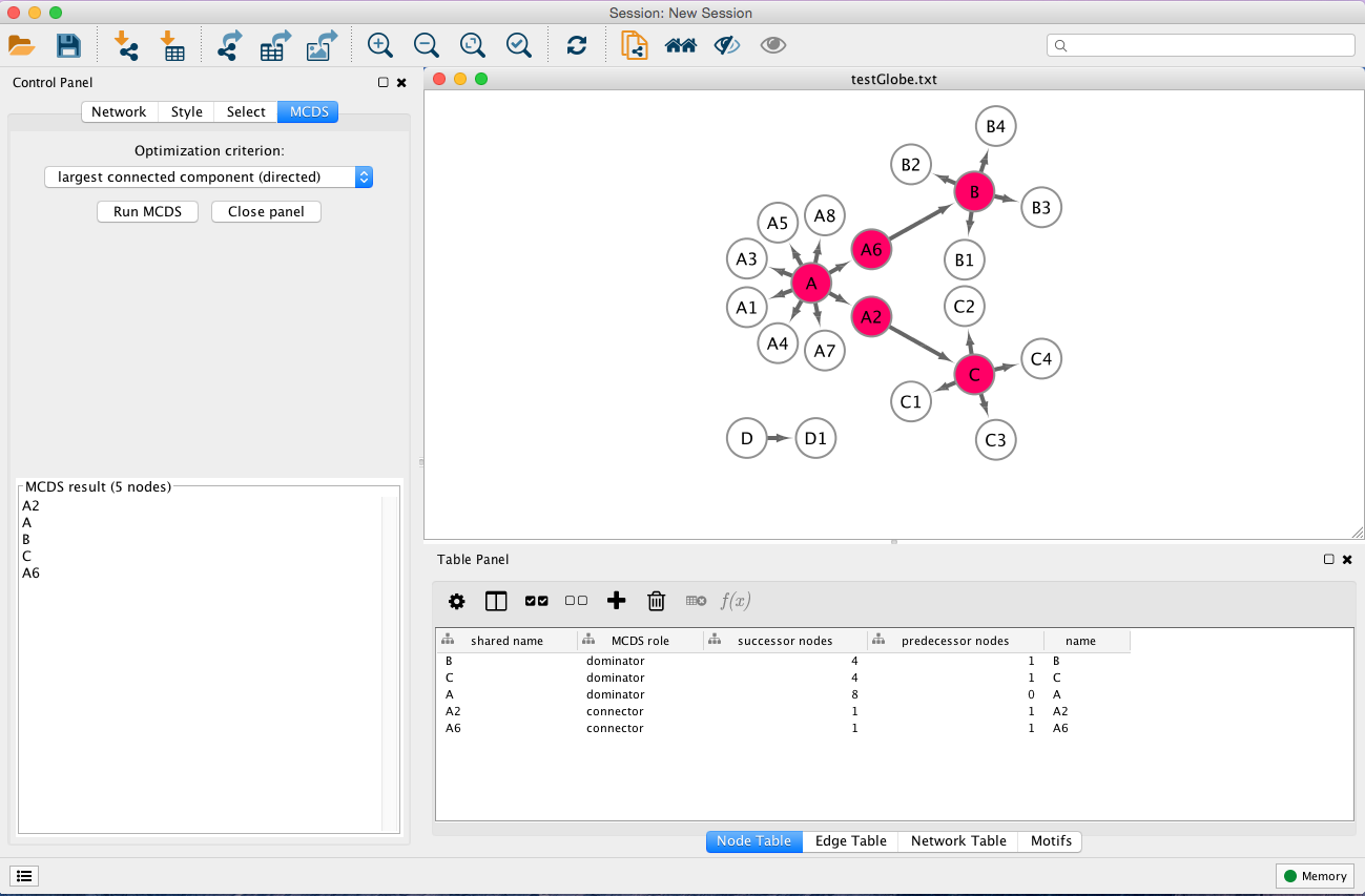 MCDS is a Cytoscape app that allows users to find an approximate MCDS solution in a directed graph. The user can choose to run the algorithm on the largest connected component underlying directed graph (LCCD) and undirected graph (LCC), as well as the strongly connected component (SCC) of the network. The connectivity among the nodes in the MCDS can then be visualized via Cytoscape.